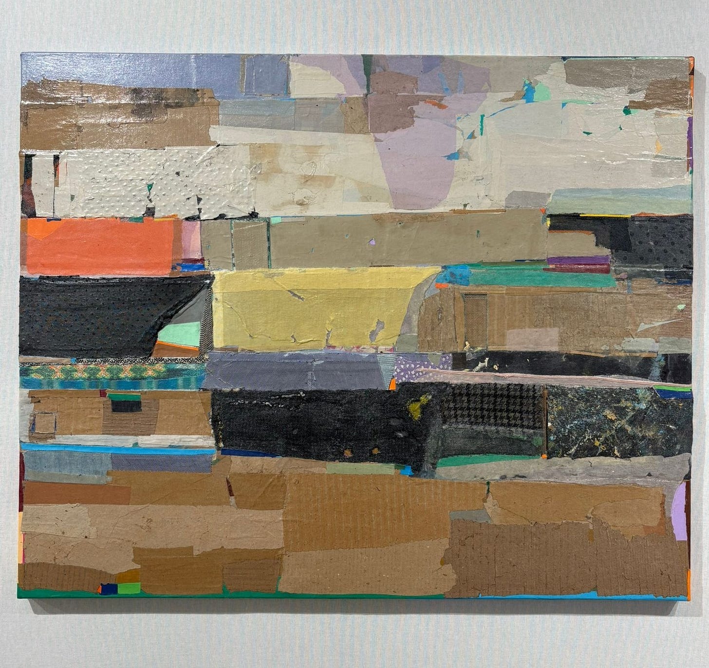We zipped through the MENA Art Fair on our way to an event and discovered work by the Palestinian artist Mohammed Joha. He uses discarded materials of cloth, paper and carton to create layered collages that reflect the chaotic, cyclical architecture of Gaza, where buildings have been destroyed, rebuilt, and rebuilt again using whatever materials remain. Joha’s work captures the enduring reality of life under institutionalized confinement, mirroring a society caught between permanence and fragility, where temporary structures become generational homes, and survival itself becomes an act of reconstruction. Prices for his work start at 3,600 USD.